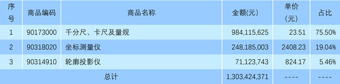 量具出口額(10億元人民幣)遠(yuǎn)遠(yuǎn)大于進(jìn)口額(3億元人民幣),量?jī)x出口額(2.6億元人民幣)遠(yuǎn)遠(yuǎn)小于進(jìn)口額(10.4億元人民幣)。