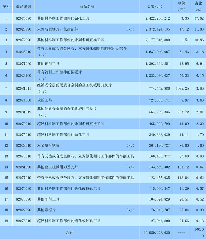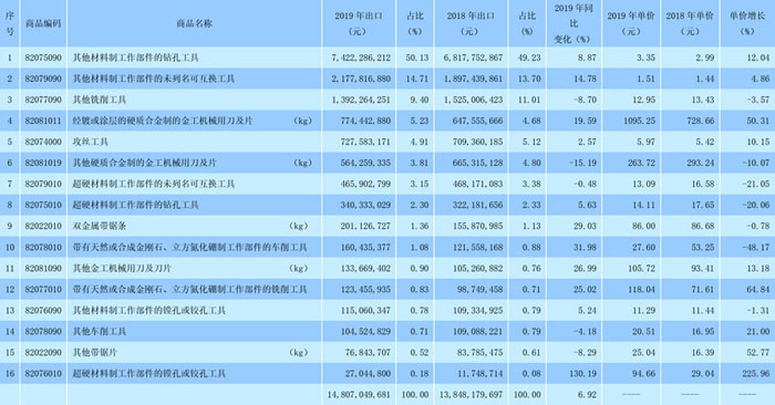 中國(guó)機(jī)床工具工業(yè)協(xié)會(huì)工具分會(huì)秘書(shū)處收集和整理了2019年我國(guó)工具(刀具、量具、量?jī)x)進(jìn)出口海關(guān)數(shù)據(jù),并進(jìn)行了計(jì)算和分析,供業(yè)界參考。所有表格都在文末。