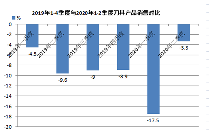 根據分會季度報表統計,2019年刀具小行業進入下行通道,一季度的銷售收入同比下降4.5%,二季度同比下降9.6%,三季度同比下降9%,四季度的同比下降8.9%。2020年一季度的銷售收入同比大幅下降17.5%,二季度同比下降明顯收窄,為3.3%。