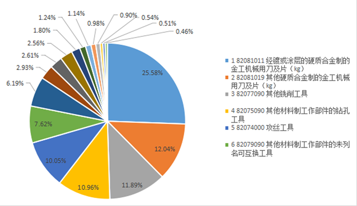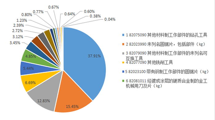 1-9月,刀具出口主要品種:鉆頭(61.54億元)、圓鋸片(33.92億元)、互換工具(20.83億元)、刀片(13.28億元)、銑刀(10.86億元)、攻絲工具(5.59億元)、超硬孔加工刀具(5.07億元)、超硬互換工具(3.88億元)、帶鋸條(2億元)。