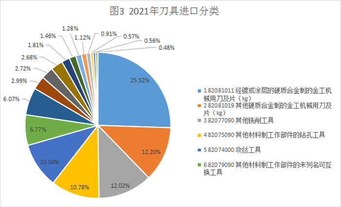 3. 2021年刀具出口主要品種:鉆頭(85.9億人民幣)、圓鋸片(47.49億人民幣)、互換工具(28.5億人民幣)、刀片(17.95億人民幣)、銑刀(15.05億人民幣)、攻絲工具(7.79億人民幣)、超硬孔加工刀具(6.68億人民幣)、超硬互換工具(5.41億人民幣)、帶鋸條(2.72億人民幣)。