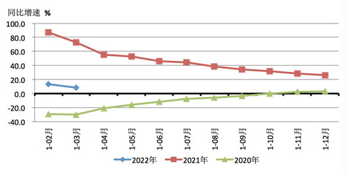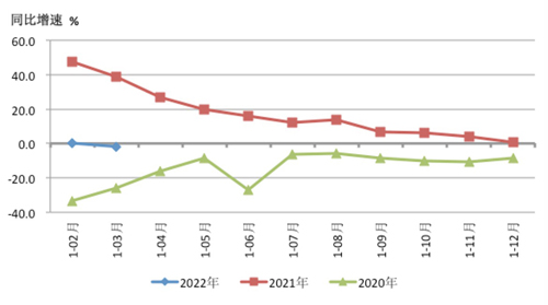 圖1是2022年1-3月與2020年、2021年重點聯(lián)系企業(yè)累計營業(yè)收入同比增速的對比。