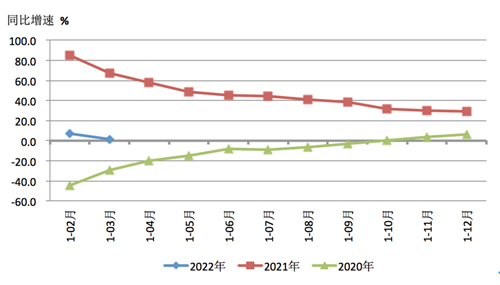 圖2、圖3分別是2022年1-3月與2020年、2021年金屬切削機床產量和金屬成形機床產量同比增速的對比。
