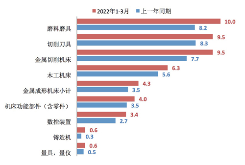 2022年1-3月,重點聯(lián)系企業(yè)營業(yè)收入同比增長8.3%,較1-2月回落5.1個百分點。在分行業(yè)中,金屬切削機床同比增長0.9%,金屬成形機床同比增長31.8%,工量具同比增長12.1%,磨料磨具同比增長13.3%,滾動功能部件的增幅最大,為34.9%。