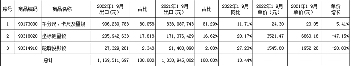 2022年1-9月量具、量儀出口占比及增長見下表。