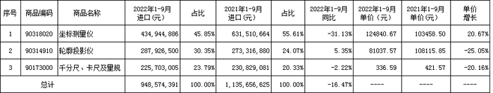 2022年1-9月量具、量儀進口占比及增長見下表。