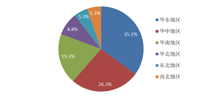 從行業上市公司的地區分布來看,華東地區居首,占35.1%;華中地區其次,占26.3%;華南地區第三,為19.3%。具體分布情況如圖1所示。