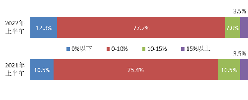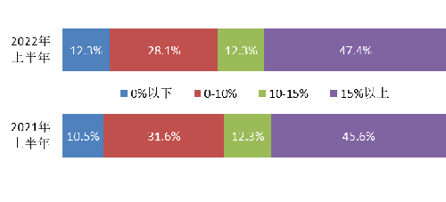 從利潤率的分布來看,2022年上半年利潤率在0%以下的企業占比為12.3%,較上年同期擴大1.8個百分點;位于0-10%之間的占比為28.1%,同比下降3.5個百分點;位于10%-15%之間的占比為12.3%,與上年同期持平;位于15%以上的占比為47.4%,同比擴大1.8個百分點。整體分布略往兩頭的區域擴展。利潤率的整體分布情況見圖4。