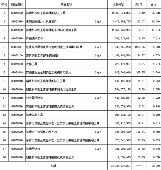 海關數據是根據海關進出口商品編碼進行分類,與行業習慣分類不完全一致。表中所列的產品可能未完全包括所有的工具產品,也可能包括了不屬于工具行業的產品。