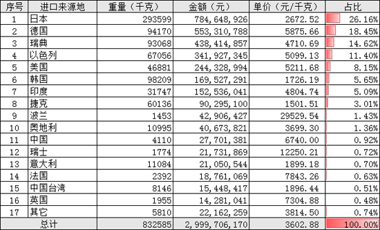 刀片進口額(41.24億元)是出口額(19.68億元)的2.1倍。進口刀片與出口刀片金額之比小于以往數據,涂層刀片出口額同比增長26.4%(見表2),而進口額同比增長10.53%(見表4),出口增長高于進口增長。