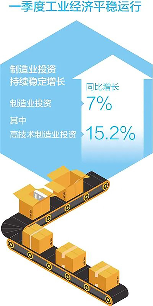 工業生產穩步回升,一季度規模以上工業增加值同比增長3%,其中制造業增加值同比增長2.9%,比去年12月份增速加快2.7個百分點。制造業投資持續穩定增長,一季度制造業投資同比增長7%,高于全國固定資產投資1.9個百分點,其中高技術制造業投資同比增長15.2%。