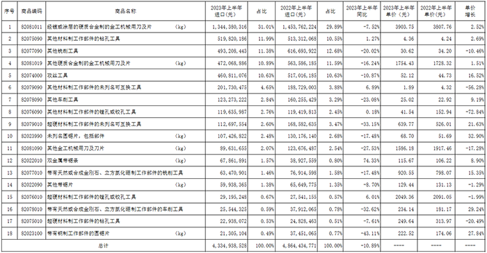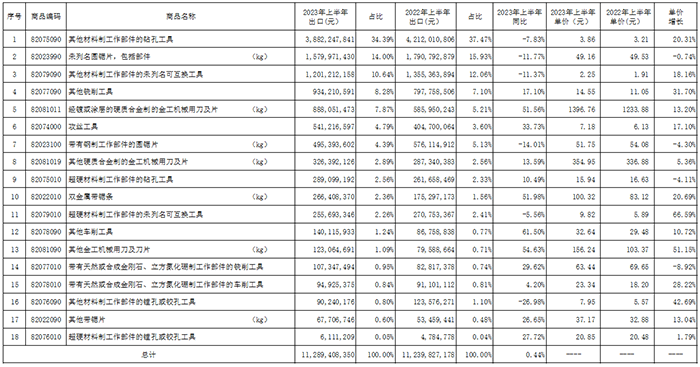 中國機床工具工業協會工具分會秘書處收集整理了2023年上半年工具(刀具、量具、量儀)進出口海關數據,并進行了計算和分析,供行業參考。