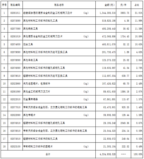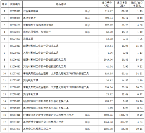 附表中,在計算產品單價時,圓鋸片、刀片、帶鋸條的單位采用公斤(kg),其它類產品以件為單位。
