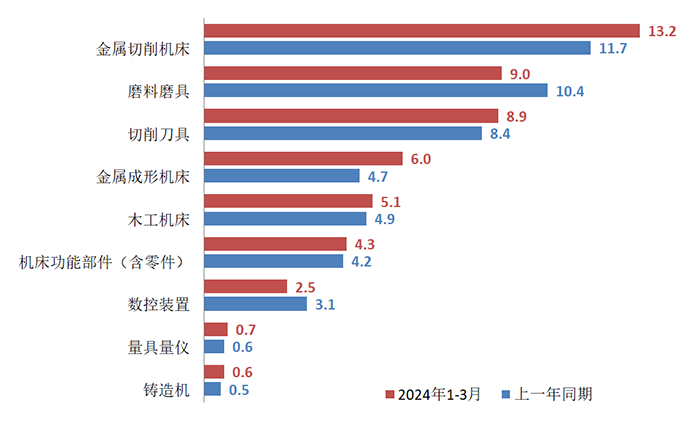 2024年1-3月,機床工具全行業完成營業收入2397億元,同比下降13.8%。其中,金屬切削機床同比下降9.2%,金屬成形機床同比增長2.6%。