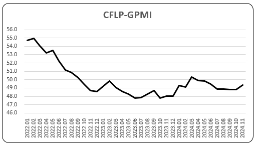 2024年11月份,非洲制造業(yè)PMI為49.2%,較上月下降0.2個(gè)百分點(diǎn),連續(xù)2個(gè)月運(yùn)行在50%的榮枯線以下。從主要國(guó)家來(lái)看,南非制造業(yè)PMI為48.1%,環(huán)比下降4.5個(gè)百分點(diǎn),在連續(xù)2個(gè)月運(yùn)行在52%以上后明顯回落,顯示南非制造業(yè)恢復(fù)勢(shì)頭明顯放緩,也是非洲制造業(yè)PMI下降的主因。埃及制造業(yè)PMI和尼日利亞制造業(yè)PMI較上月有不同程度上升,但指數(shù)均在50%以下。
