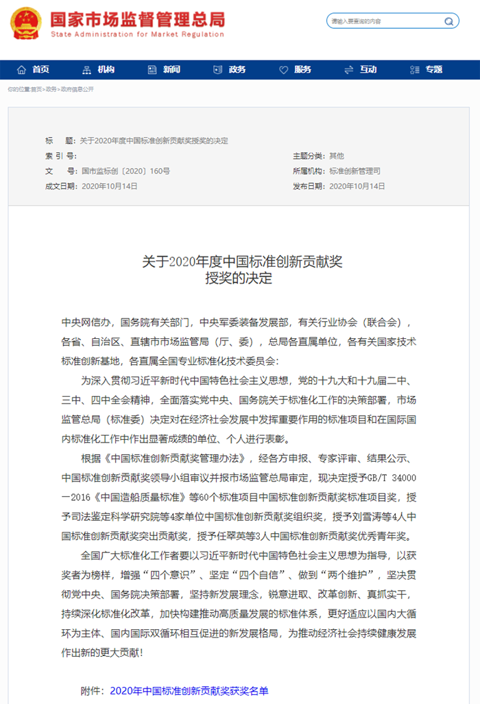 獲2020年中國標準創(chuàng)新貢獻獎一等獎