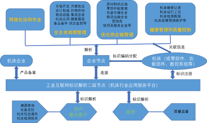 機床制造業產品種類數量非常多,工業互聯網標識解析二級節點(機床行業)的建設,為機床生產企業提供靈活的標識編碼注冊和標識解析服務。標識編碼規范的有效執行,對促進機床領域的網絡化協同設計制造、供應鏈管理、產品追溯、質量監督、產品全生命周期管理等具有積極的推動作用;通過與用戶及應用場景的互聯互通,可對機床實施有效的狀態監測、故障預測和優化控制,提升自動化水平,減少人為錯誤的發生及人工成本,提高管理效率和數據應用范疇,從而產生可觀的經濟效益。