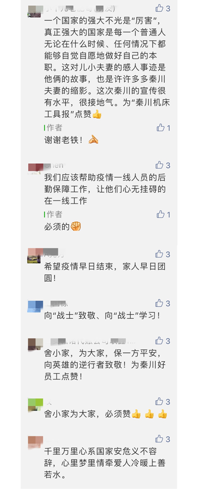 日前,看到“秦川機床工具報”一條推送,講述一名年輕員工的妻子去武漢戰“疫”一線,丈夫及家人給予大力支持的感人故事。今在此轉發,祝愿奮戰在抗“疫”一線的千千萬萬兄弟姐妹們都平安、順利!家人一直和你們在一起!