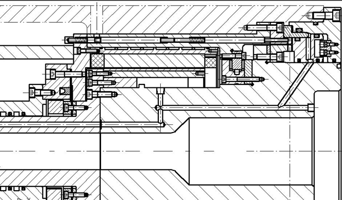 對主軸刀具高壓內冷進水結構也進行了改進,原結構在使用一段時間后,受機加件加工精度的工作影響,存在漏水問題,影響使用壽命。將原結構改為旋轉接頭,靠高壓水壓力自動密封接頭,有效解決了結構漏水,提高了使用壽命,增加密封可靠性。