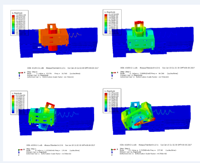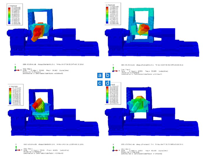 (a)機床整機一階模態圖(b)機床整機二階模態(c)機床整機三階模態(d)機床整機四階模態