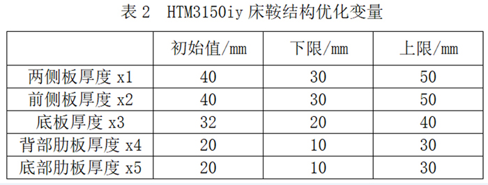在HTM3150iy的床鞍結構研究中,進行了結構尺寸優化的研究工作。如圖13所示,其中,x1為兩側板厚度,x2為前側板厚度,x3為底板厚度,x4為背部肋板厚度,x5為底部肋板厚度。其優化變量見表2。