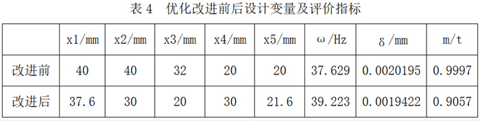 由表4可以看出,經過優化改進后機床一階固有頻率提高了4.24%,最大變形量減小了3.83%,同時床鞍的質量減輕了94kg,減少了9.4%。此次優化在減輕了床鞍質量的前提下,同時提高了一階固有頻率,并且降低了機床床鞍最大變形量,且結構的靜動態特性有所加強,因此該尺寸優化改進是可行的。