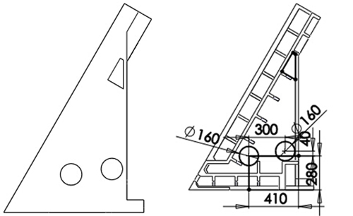 從鑄造工藝及加工成本方面進行考慮,根據床鞍拓撲優化的結果,兼顧鑄造方便性及可行性,建議分別在兩側板的下部開兩個圓孔,在兩側的上部開一個孔,改進后的結構如圖17所示。