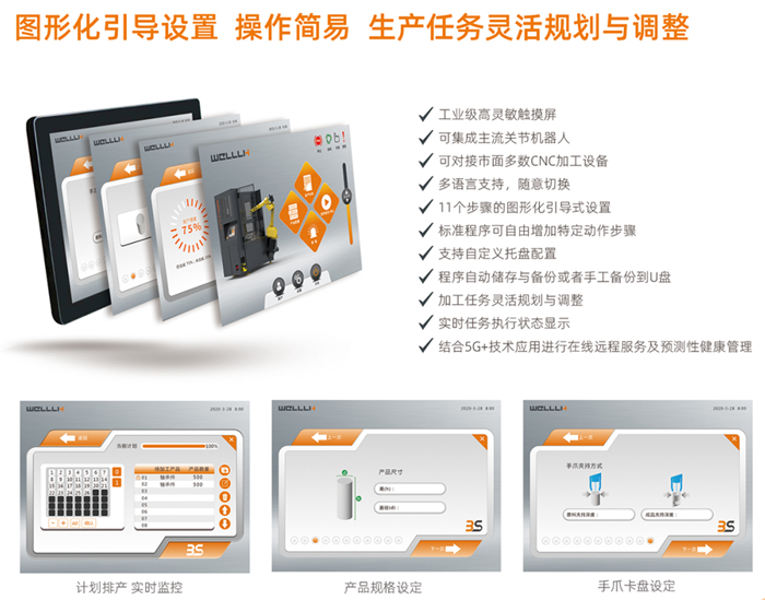 3S柔性智能工作站特點:WELLLIH 3S智能控制,無需任何機器人操作經驗;操作簡單,設置時間短,適用于中小批量生產;無需停機,即可添加新工件加工計劃;配置地面掃描儀,提供更高級別的安全防護;緊湊型一體化設計,占地面積少,方便移動到另一臺機床,符合現代化工廠管理;適用于立式加工中心、數控車床(車銑復合);運用5G等通信技術,結合AR與大數據分析,進行在線遠程服務及預測性運維,實時監測設備狀態。