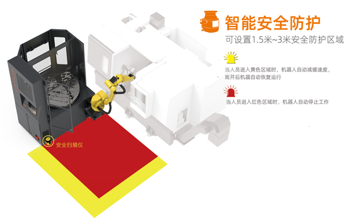 工作站具有智能安全防護功能:配備地面掃描儀,可自動減慢和停止機器人,無需圍欄,保證人員安全,增強安全防護級別。