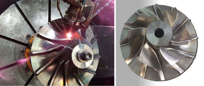 左圖-激光送粉的直接能量沉積原理圖 右圖-激光送粉沉積空心葉片
