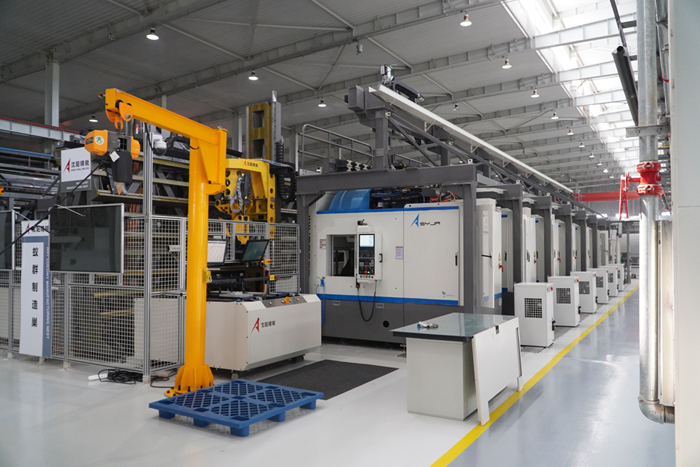 由沈陽飛機工業集團有限公司、沈陽航空產業集團、沈陽航空制造有限公司、武漢華中數控股份有限公司等企業合作建設的航空復雜結構件智能制造生產基地項目,共有國產高檔數控機床57臺,其中配套華中數控系統的機床49臺(五軸機床33臺)。該基地項目是國內航空航天領域首條全部應用國產高檔數控設備的智能制造生產線,同時也是航空航天領域配套華中8型五軸數控系統最多的智能制造生產線,是國產數控機床、國產數控系統與航空工業合作的有益探索。