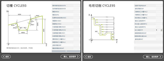 循環引導編程:引導編程包括標準化循環和定制化循環支持。標準化循環支持標準車削、銑削、鉆孔、攻絲、鏜孔循環;可以通過圖形化引導編程頁面實現快速編程和修改。定制化循環可根據特定的工藝要求定制開發,實現高效便捷生成,如車床的毛胚切削、切槽等。