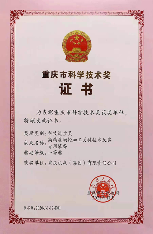 2021年11月19日,重慶市召開科學技術獎勵大會,由重慶機床集團牽頭完成的“高精度蝸輪加工關鍵技術及其專用裝備”項目榮獲重慶市科技進步一等獎。