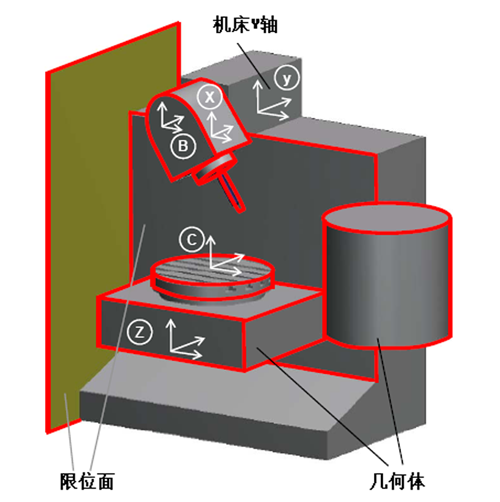 數控機床尤其五軸數控機床,由于其機床本體結構、加工路徑、操作、編程、工裝夾具等極為復雜,一旦出現操作及編程疏忽,如刀具長度、工件原點設置錯誤,機床部件與毛坯件、工裝、夾具等輔助部件發生運動干涉(見圖1)等,都極易造成數控機床意外碰撞,輕則刀具破損,重則主軸、銑頭、工件損壞,機床精度喪失,長時間故障停機等,給企業造成重大經濟損失,嚴重影響企業科研生產。