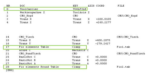 ②建立夾具以及刀柄實體。同樣是使用Kinematics Design軟件對常用夾具以及刀柄進行描述定義,并將生成的模板文件拷貝到數控系統TNC分區的根目錄下。為了生效夾具以及刀柄,必須在Kinematics Table中擴展定義TOOLFILE以及Clamp,如圖3所示。