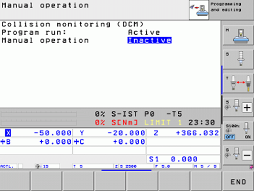 ③DCM功能使用方法。完成以上配置后,可在海德漢iTNC530數控系統上使用DCM功能。在手動操作菜單項中,進入COLLISION界面,可分別在程序運行和手動操作狀態下打開或關閉DCM功能,如圖4所示。