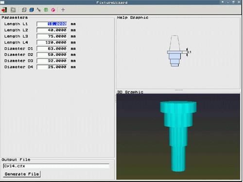 關于刀具參數,如刀長、直徑等,數控系統可以從刀具表中獲得。但刀柄的形狀則各不相同,為了實現刀柄監控,還必須對刀柄的形狀進行描述定義,如圖6所示,設定方法與夾具設置方法類似。