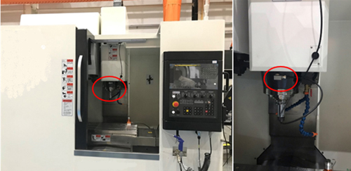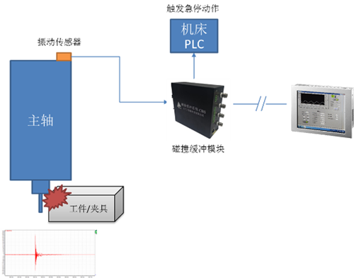 以一臺三軸立式加工中心為例,在機床主軸端安裝振動傳感器,如圖9所示,越接近主軸鼻端效果越佳。通過振動傳感器進行數控機床碰撞識別,通常振動加速度≥30m/s2時,判斷為碰撞事件,同時監控模塊在3ms內發出報警信號,給機床控制系統觸發急停報警,機床快速停止,如圖10所示,將碰撞造成的損壞降到最低。