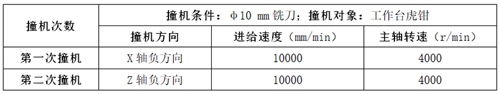 ①試驗條件:一臺三軸立式加工中心,配置FANUC 0I數控系統,以G00速度(最大移動速度)分別從X和Z方向進行兩次撞機測試(具體條件如表1所示),測量撞機前后主軸靜態和動態精度差異,用以驗證碰撞保護功能效果。
