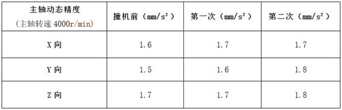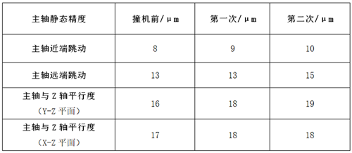 ②試驗結果:通過兩次撞機測試,檢測撞機前后主軸靜態精度和動態精度(如表2、表3所示),主軸靜態和動態精度均未發生明顯變化,碰撞保護功能效果良好。