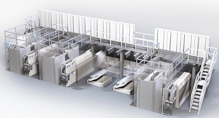 圖4為由搬運(yùn)小車組成的航空結(jié)構(gòu)件生產(chǎn)線。由于航空結(jié)構(gòu)件多采用大去除率的加工設(shè)備,故該類加工設(shè)備工作臺(tái)垂直布置,工件在上下料位進(jìn)行水平上料與下料,之后翻起,再交換到RGV小車上,由小車運(yùn)送到不同位置機(jī)床進(jìn)行上下料,料庫也是垂直地面布置。雖然航空結(jié)構(gòu)件都很大,但這種長線布局方式占地面積小,結(jié)構(gòu)緊湊。如斯達(dá)拉格的Ecospeed航空結(jié)構(gòu)件自動(dòng)線被應(yīng)用于很多飛機(jī)結(jié)構(gòu)件生產(chǎn)商。