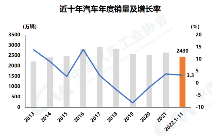 中汽協數據顯示,11月,汽車產銷略顯疲態,環同比均呈現下降,下行趨勢明顯,總體表現不及預期。當月產銷分別達到238.6萬輛和232.8萬輛,環比分別下降8.2%和7.1%,同比均下降7.9%。與2021和2020年相比,并未出現往年的年底翹尾現象。1-11月,汽車產銷分別達到2462.8萬輛和2430.2萬輛,同比分別增長6.1%和3.3%,累計增速放緩,較1-10月分別收窄1.8和1.3個百分點。