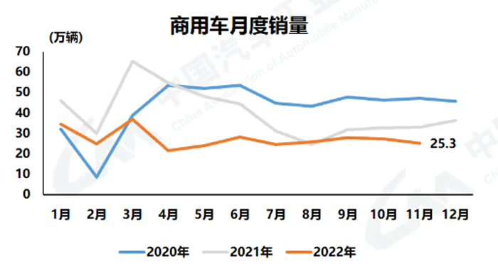 11月,商用車產銷分別完成23.5萬輛和25.3萬輛,環比分別下降11.2%和7.5%,同比分別下降33.4%和23.4%。在商用車主要品種中,與上月相比,客車產量下降、銷量小幅增長,貨車產銷均呈下降;與上年同期相比,客車、貨車產銷均呈不同程度下降,其中貨車降幅更為明顯。1-11月,商用車產銷分別完成292.7萬輛和301萬輛,同比分別下降31.9%和32.1%,繼續呈現兩位數下滑。在商用車主要品種中,與上年同期相比,客車和貨車產銷均呈較快下降。商用車依然處于低位徘徊態勢。