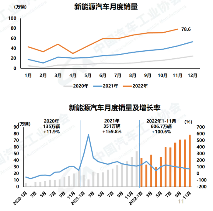 11月,新能源汽車繼續保持快速增長,月度產銷再創新高,分別達到76.8萬輛和78.6萬輛,同比分別增長65.6%和72.3%,市場占有率達到33.8%。1-11月,新能源汽車產銷分別達到625.3萬輛和606.7萬輛,同比均增長1倍,市場占有率達到25%。