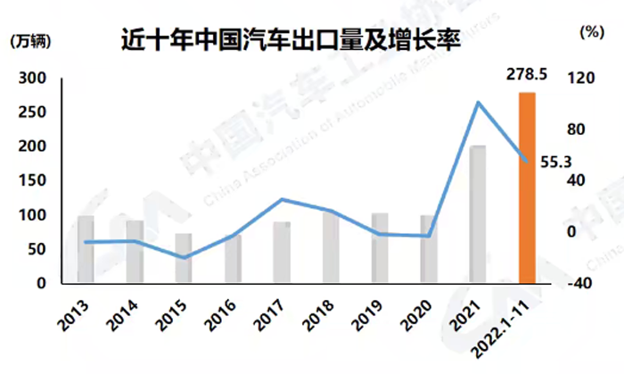 11月,汽車企業出口32.9萬輛,環比下降2.5%,同比增長64.8%。其中,乘用車出口27.6萬輛,環比下降1%,同比增長62.2%;商用車出口5.3萬輛,環比下降9.5%,同比增長79.7%。新能源汽車出口9.5萬輛,環比下降13.2%,同比增長1.5倍。1-11月,汽車企業出口278.5萬輛,同比增長55.3%。其中,乘用車出口225.1萬輛,同比增長57.8%,商用車出口53.3萬輛,同比增長45.7%。新能源汽車出口59.3萬輛,同比增長1倍。