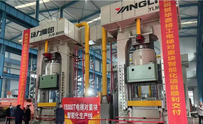 揚(yáng)力集團(tuán)發(fā)布12000噸超大型復(fù)合材料熱成型伺服液壓機(jī)和15000噸電梯對(duì)重塊智能線