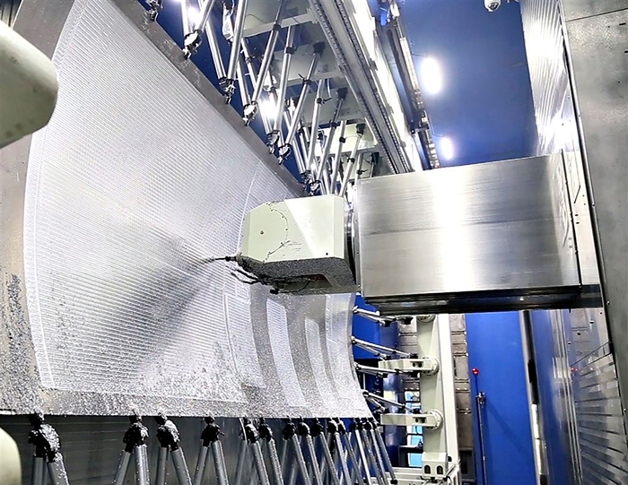拓璞數(shù)控研制的立式雙五軸鏡像銑裝備,加工的最薄壁厚僅相當(dāng)于一張身份證的厚度;研制的12米臥式雙五軸鏡像銑裝備,解決了大尺寸蒙皮精密加工的難題;發(fā)明的柔性裝卡-在機(jī)建模-加工規(guī)劃成套工藝系統(tǒng)與軟件,實(shí)現(xiàn)了任意形狀蒙皮的快速裝卡與自動(dòng)化生產(chǎn),大大提高了加工效率。