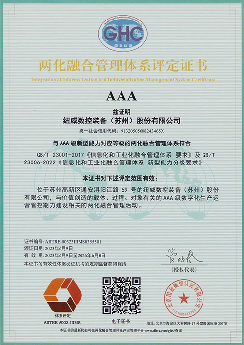2022年紐威數控啟動了兩化融合管理體系貫標工作,按照《信息化和工業化融合管理體系要求》及《信息化和工業化融合管理體系新型能力分級要求》,完成了兩化融合管理體系文件編制與修訂、運行、內部審核、管理評審等工作。2023年5月,經專家審核組的現場審核及國家兩化融合評定委員會評定,公司順利通過了兩化融合管理體系AAA級評定。