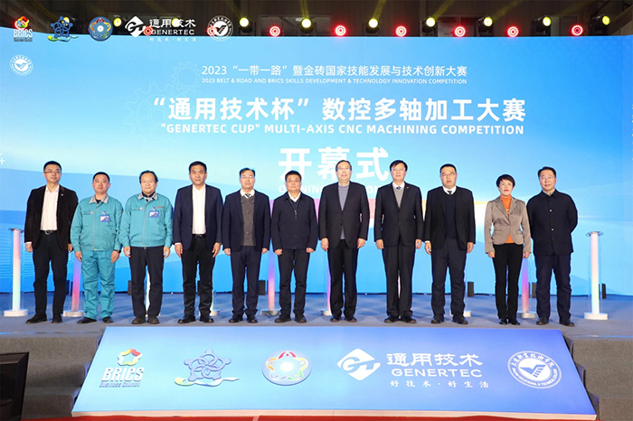 開幕式上,現(xiàn)場(chǎng)嘉賓共同觸摸啟動(dòng)柱,宣布2023“一帶一路”暨金磚國(guó)家技能發(fā)展與技術(shù)創(chuàng)新大賽之“通用技術(shù)杯”數(shù)控多軸加工大賽開幕。