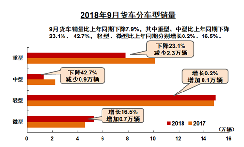 1-9月,貨車產銷280.14萬輛和289.78萬輛,同比增長6.21%和7.61%。其中:重型貨車產量同比下降1.18%,銷量增長2.44%;中型貨車產銷同比下降16.08%和13.62%;輕型貨車產銷同比增長11.85%和13.28%。客車產銷同比下降2.74%和3.75%。其中:大型客車產銷同比增長5.54%和5.25%;中型客車產量同比增長0.70%,銷量下降2.91%。